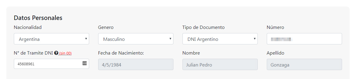 Completar la nacionalidad, género, tipo y número de documento. Al momento de completar el número de trámite de DNI, asegurarse de tener el último ejemplar en la mano y escribir los números que aparecen sin los ceros.