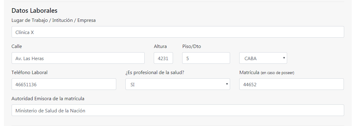 Completar la información del lugar de trabajo y dirección. Si es profesional de salud deberá explicitarlo junto con su matrícula y la autoridad que la expidió (si corresponde)