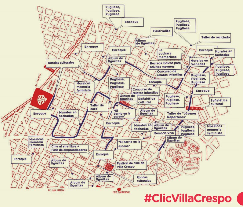 El proyecto representa un entramado de vínculos, ideas, saberes y experiencias culturales puesto en función de enriquecer la vida cultural de Villa Crespo, de construir y deconstruir su profunda identidad. Busca crear a través de sus historias, personajes y valores; y releer las memorias que guarda el corazón de la Ciudad. Son el Circuito Local de Intervenciones Culturales (CLIC).
