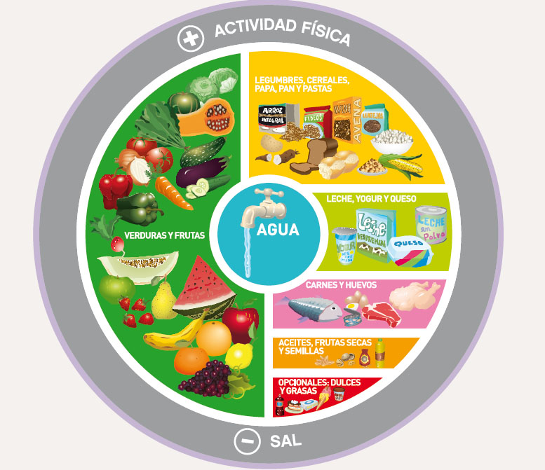 El agua tiene una ubicación central en la gráfica, debido a su importancia para la salud. La recomendación es tomar a diario 8 vasos de agua segura.