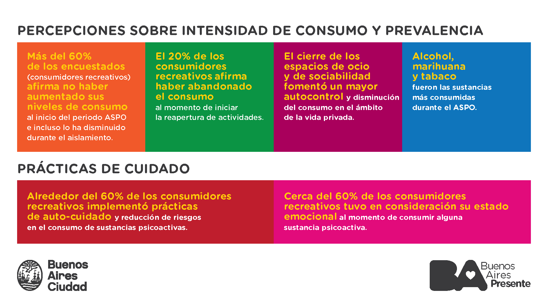Entre los principales resultados se destaca que los participantes respondieron que su consumo de sustancias disminuyó o no varió durante la cuarentena, en parte por el cierre de los espacios de ocio donde ocurren la mayoría de los consumos recreativos y por el autocontrol del consumo en el ámbito privado.