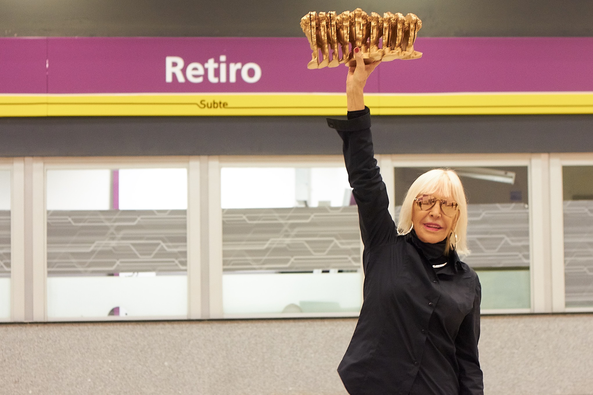 La reconocida artista plástica de Buenos Aires, ícono del arte de vanguardia de la Argentina en la década del 60, estudió en la Escuela Nacional de Bellas Artes “Prilidiano Pueyrredón” y la Escuela Superior de Bellas Artes “Ernesto de la Cárcova”. En 1982 y 2002 recibió el Premio Konex y fue la creadora de “La Menesunda” y "El Partenón de los libros prohibidos" entre otras obras disruptivas. "David fragmentándose", prima hermana de la escultura presente en el Museo Fortabat, tiene un tamaño de 7 por 2,4 metros y está colgando del techo de la estación, representando a los argentinos que viven en fragmentación y discontinuidad. Además se instaló un espejo a 45 grados, sobre el techo de la boletería, que refleja la escultura y tiene la firma de la artista con luces de neón.
