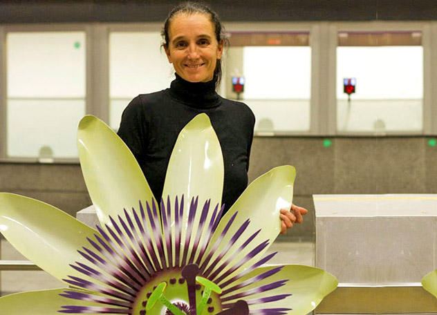 Nacida en La Plata, es docente y licenciada en Artes Plásticas con orientación en escultura, tuvo una estadía en el master en Diseño y Biónica del Centro de Investigación del Instituto Europeo de Diseño de Milán, Italia, y ha sido protagonista de exposiciones en Argentina, Italia, España, Francia y Alemania. "Pasionarias a orillas del río", es el nombre de la obra que recorre dos paredes de la estación a través de enredaderas - una de 17,6 metros de largo y otra de 7,6 metros - con 11 y 4 flores