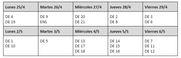 Del lunes 25 de abril al viernes 6 de mayo cada docente deberá participar en el día que le fue asignado a su distrito escolar y mantendrá el turno y el área de contenidos en los que participó en la instancia de febrero.