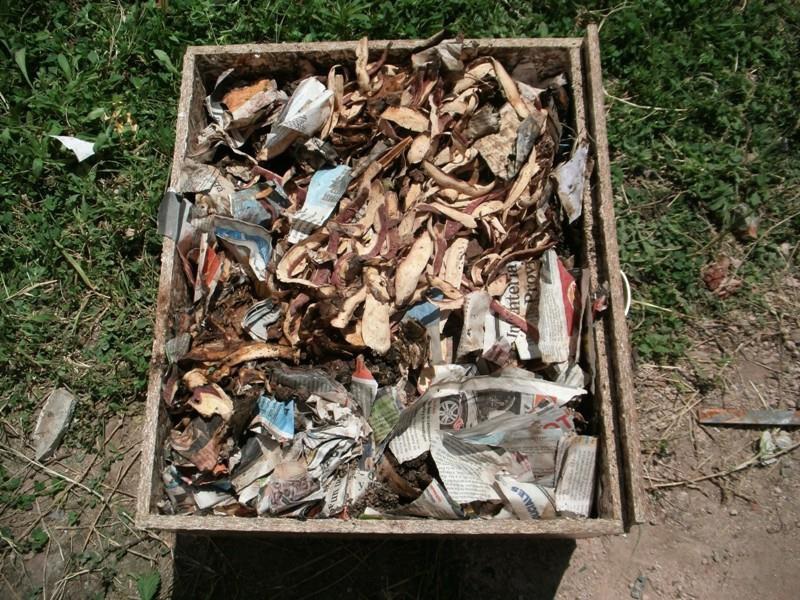 - Colocar en la base del recipiente perforado una capa de cartón y sobre ella otra de papel del diario. Colocar una fina capa de tierra ya que contiene microorganismos que ayudarán a la descomposición, solo si dispones en casa.