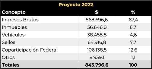 Para el 2022, los ingresos tributarios se calculan en $ 843.796 millones, con una estimación de ingresos tributarios propios de $ 737.658 millones (87,4% del total), en tanto que los recursos provenientes de la Coparticipación Federal se estiman en $ 106.138 millones (12,6% restante).
