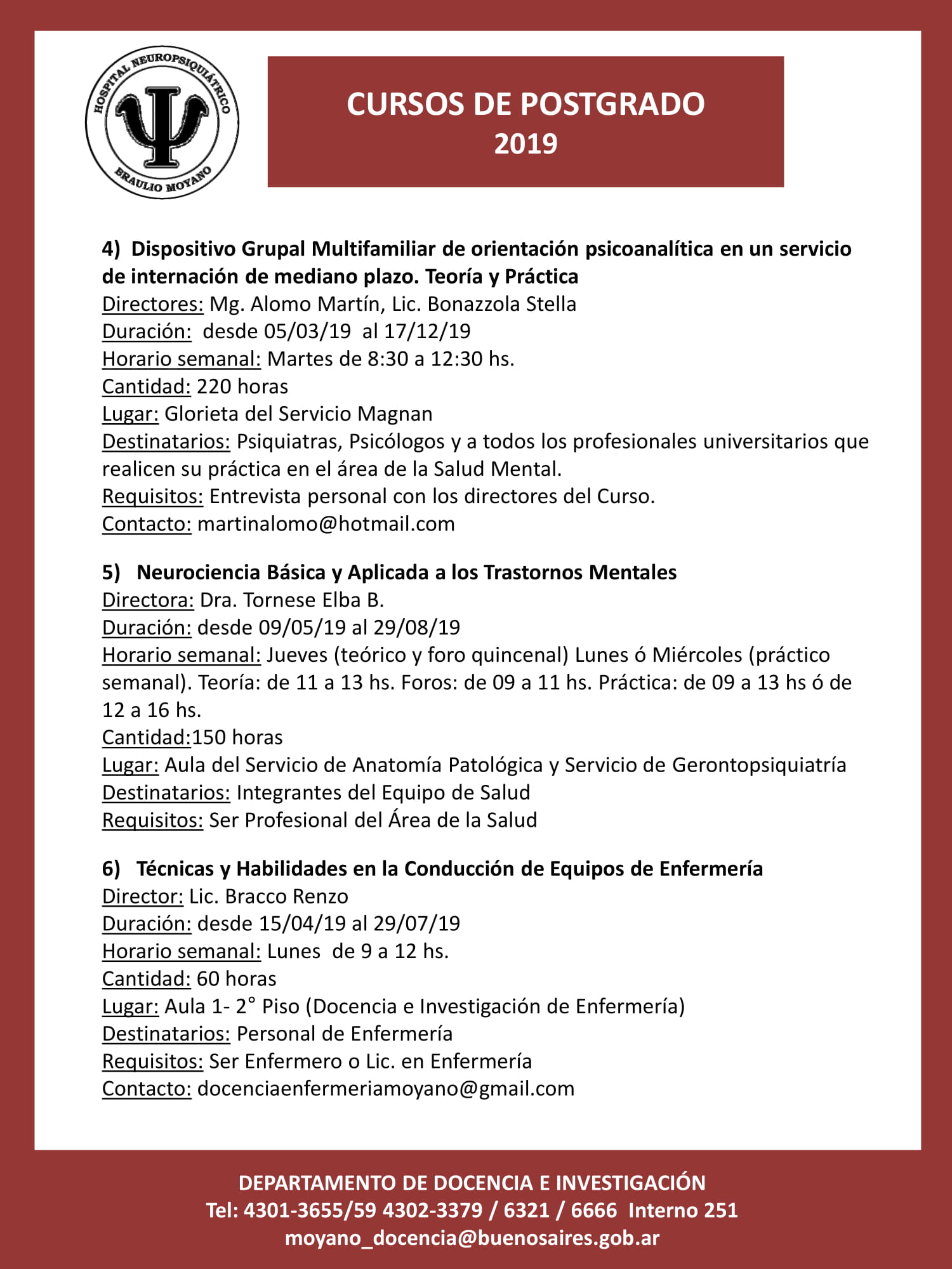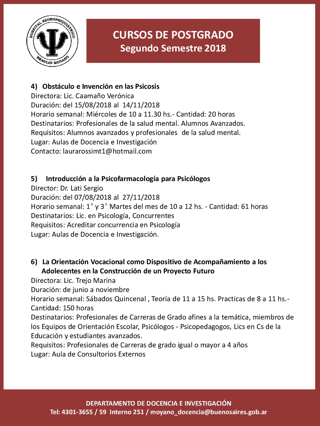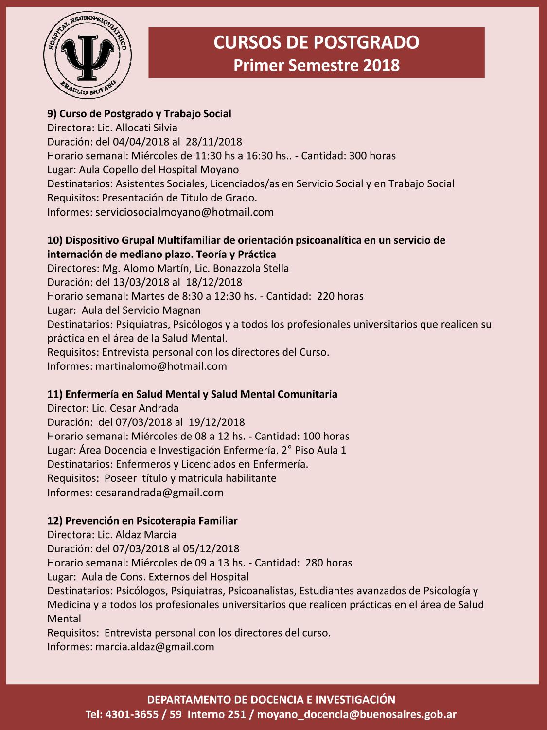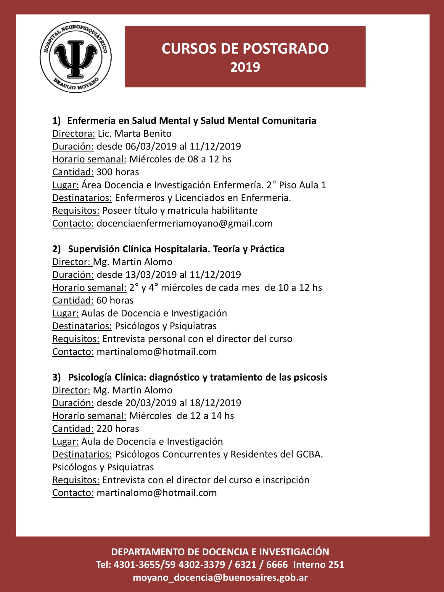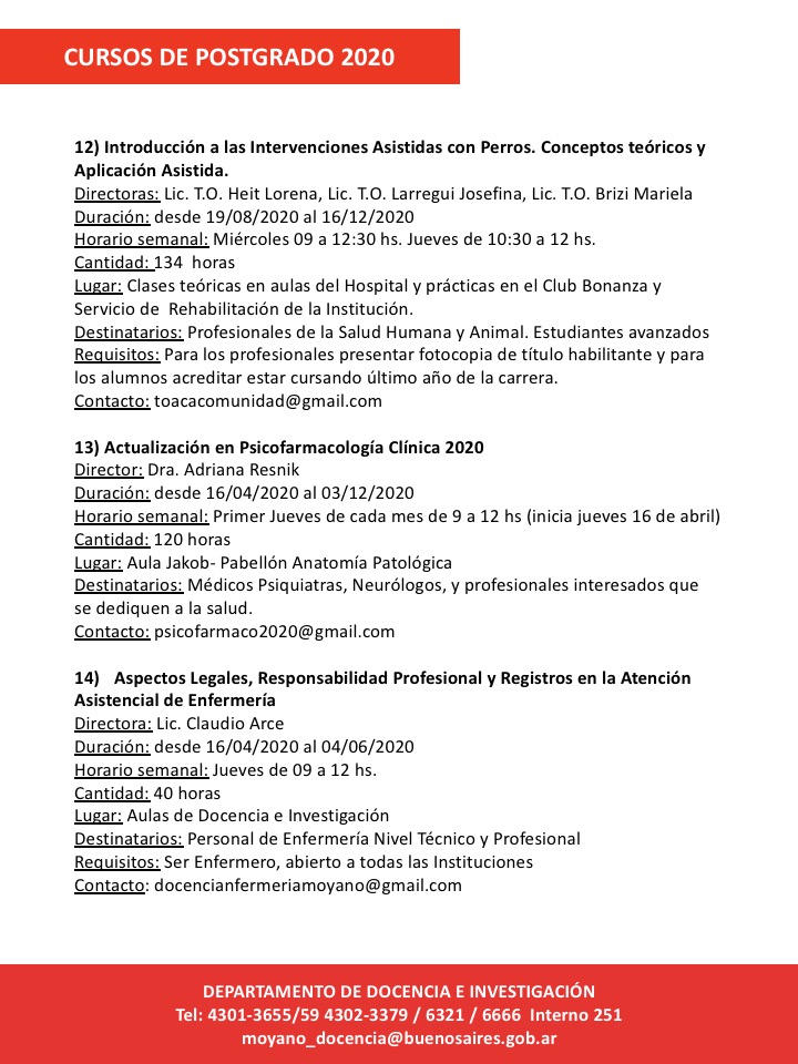 Informes e inscripción: admisionhospitalmoyano@gmail.com