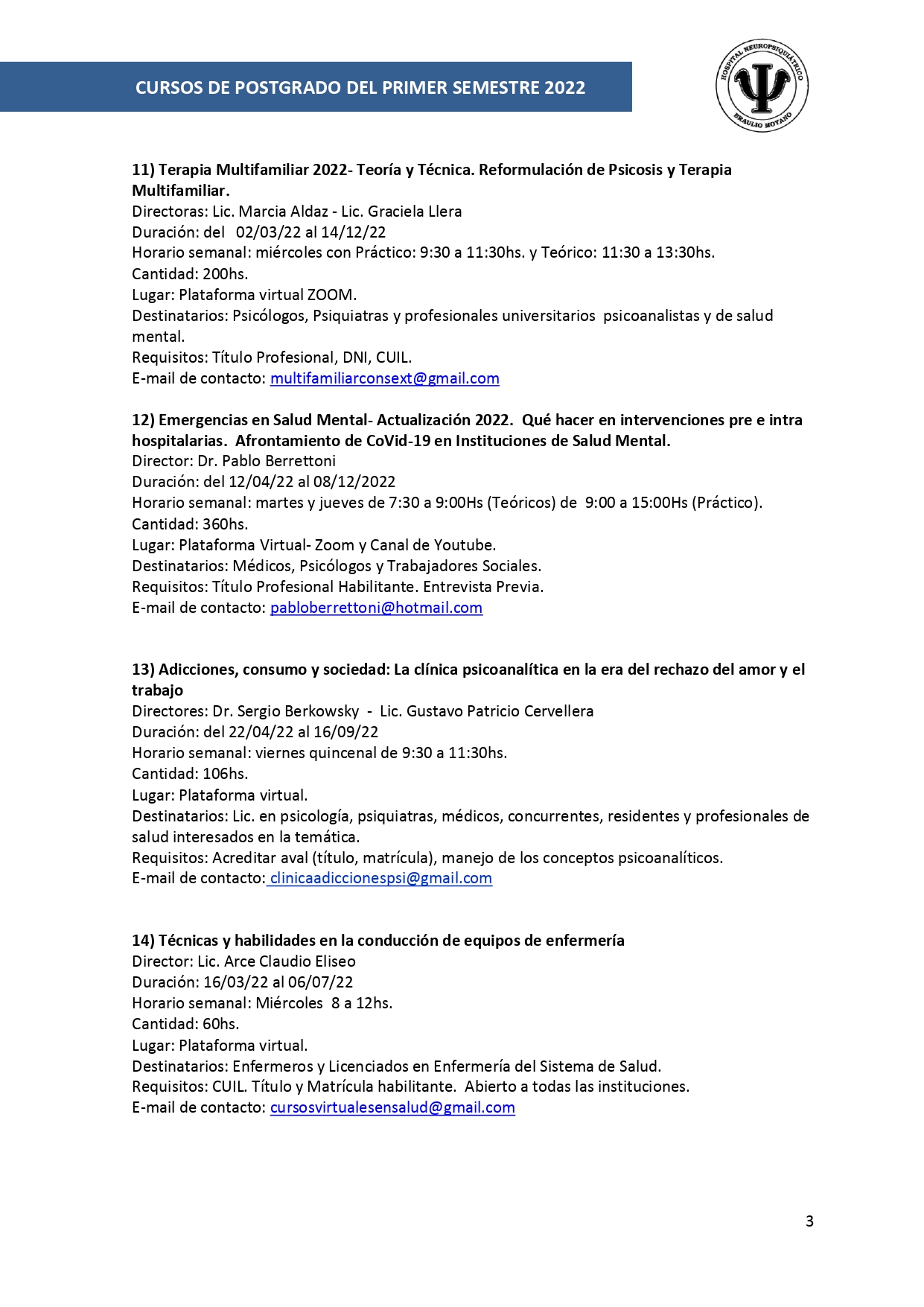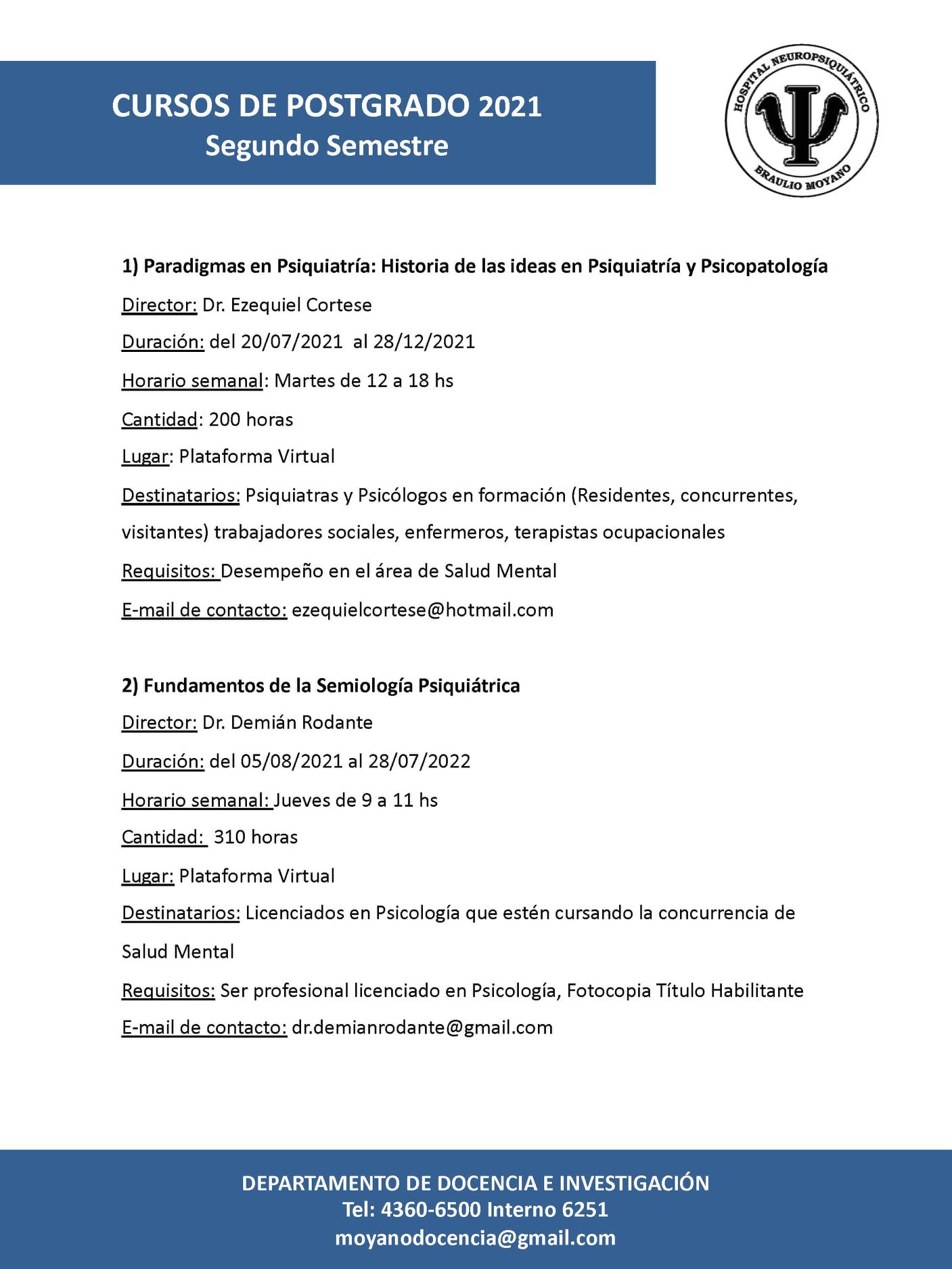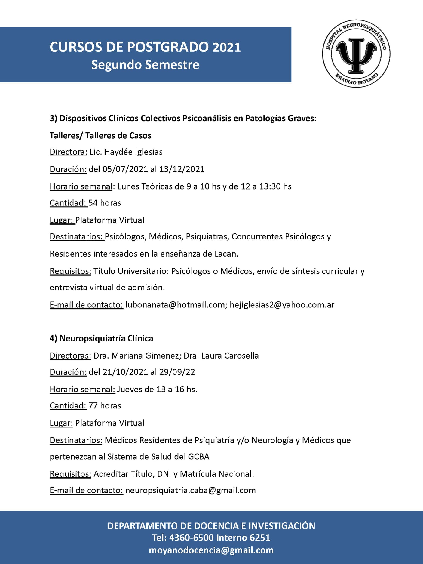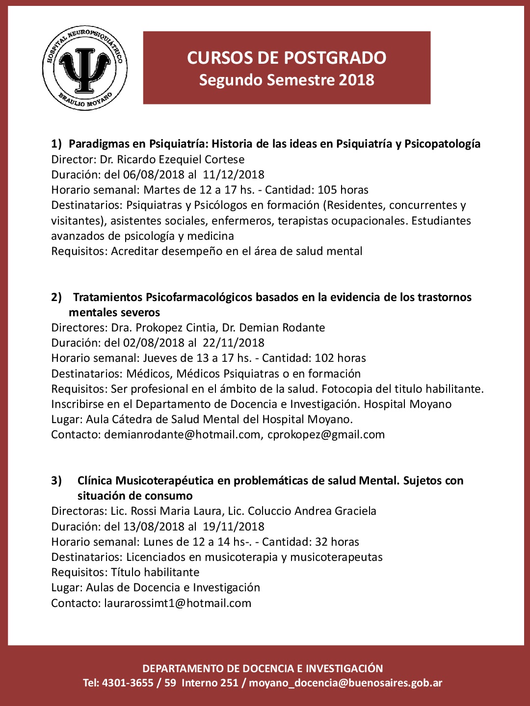 Informes e inscripción: admisionhospitalmoyano@gmail.com