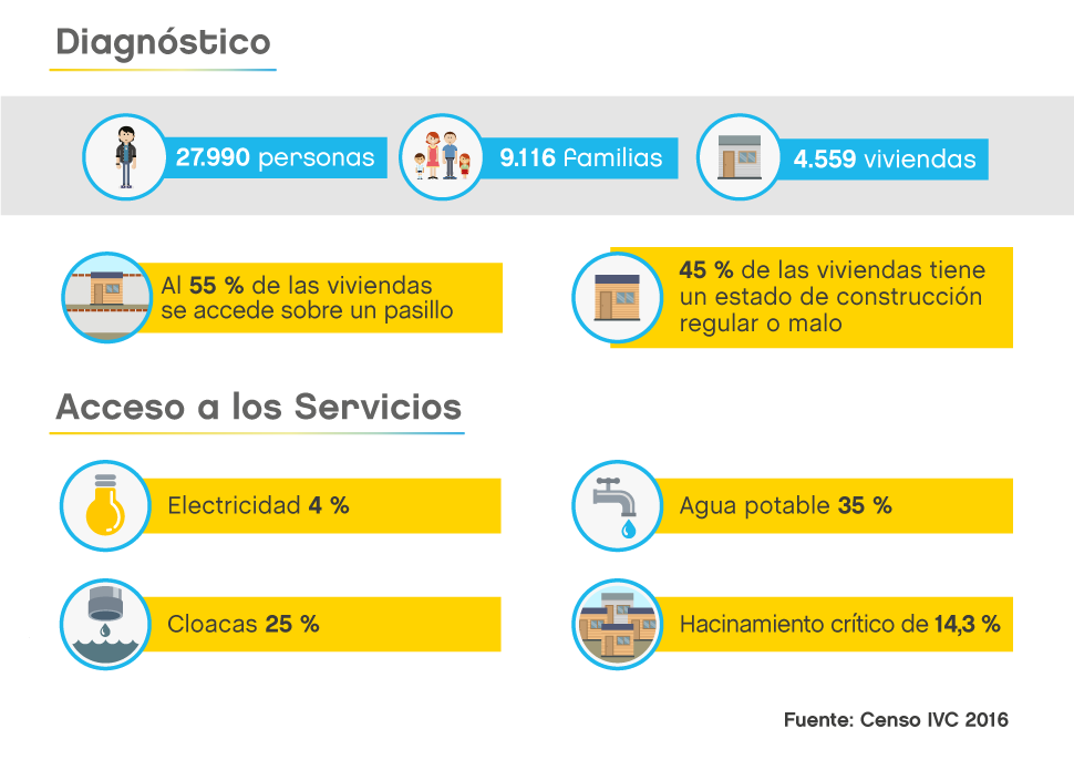 De acuerdo al relevamiento realizado en el año 2010 por la Dirección General de Estadística y Censos de GCBA, la cantidad de vecinos que acceden a los servicios es la siguiente: electricidad 4 %; cloacas 25 %; agua potable 35 %; y hay un hacinamiento crítico de 14,3 %.