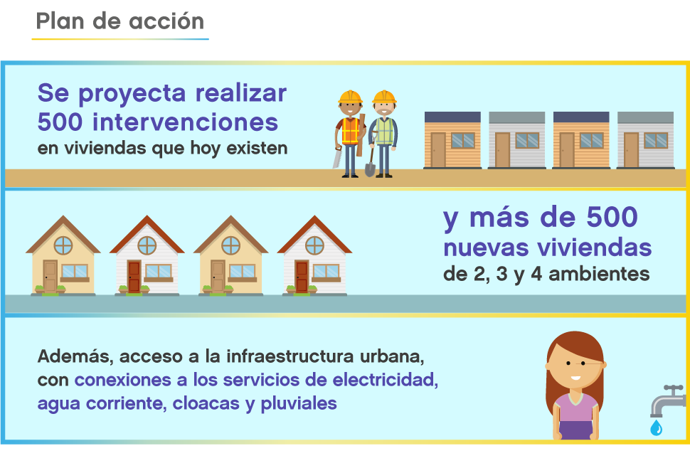 Se planifica la construcción de aproximadamente 500 viviendas nuevas de 2, 3 y 4 ambientes y 500 mejoramientos de viviendas. Además, se garantizará el acceso a la infraestructura urbana, con conexiones a los servicios de electricidad, agua corriente, cloacas y pluviales.