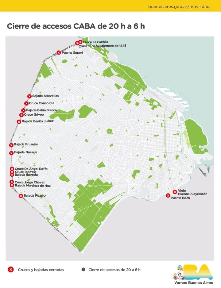 Desde el Gobierno de la Ciudad de Buenos Aires informamos que desde el viernes 30 de abril se restringirá la circulación vehicular en 18 accesos a la Ciudad desde las 20 hasta las 6 horas. Además, se cerrarán 6 estaciones de subte con el fin de administrar el ingreso de usuarios a las estaciones y reforzar los controles de aforo y de permisos. Estas medidas acompañan al DNU emitido por el Gobierno Nacional.