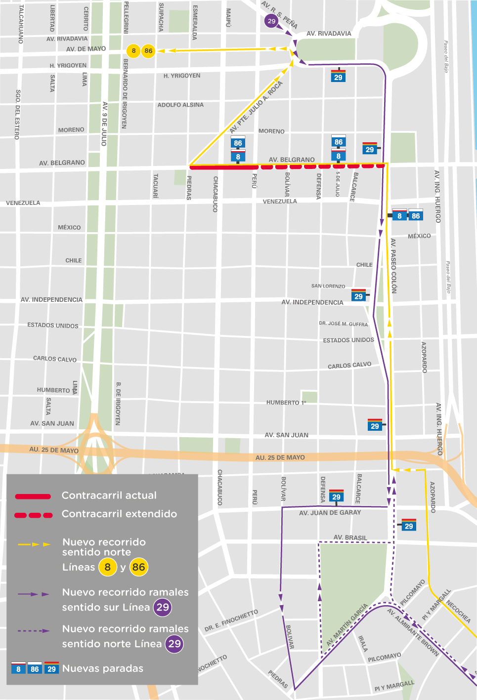 Antes el contracarril de av. Belgrano tenía una extensión de dos cuadras (entre las calles Piedras y Perú). Con este nueva propuesta el contracarril llega hasta Metrobus del Bajo para posibilitar el giro de las líneas 8 y 86 sentido norte. Además, en sentido sur, se incorporó a los carriles exclusivos la línea 29.