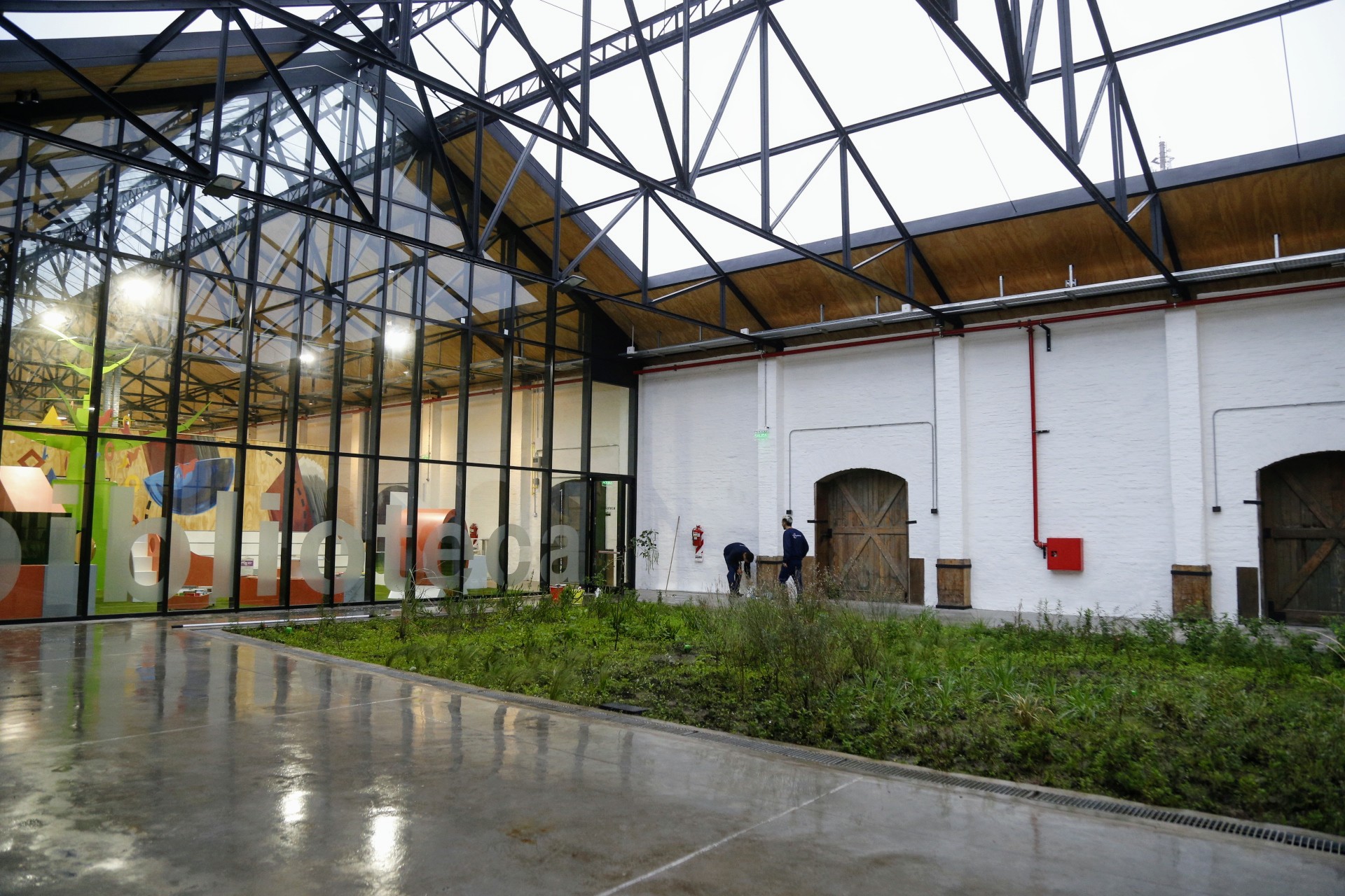 En el interior del galpón ferroviario se generaron dos patios con fachadas vidriadas para mejorar la iluminación y subdividir el pabellón en tres partes articuladas.