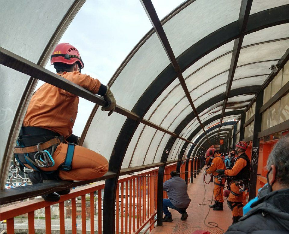 Al mismo tiempo, otro grupo se equipó con cuerdas y arneses para acceder a la víctima desde ambos laterales por la baranda del cruce peatonal.