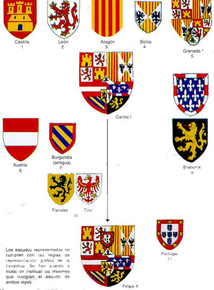 (… los ancestros del emperador Carlos V (…) muestran que cinco de sus antepasados vinieron de la península: él fue más hispánico que ningún otro. Su escudo de armas muestra en la mitad superior Castilla y León, Aragón y Sicilia como Granada ( N° 1 al 5), en la parte inferior, Austria, La Burgundia antigua y moderna y Bravante, con Flandes y Tirol en conjunto central" (N° 6 al 10).