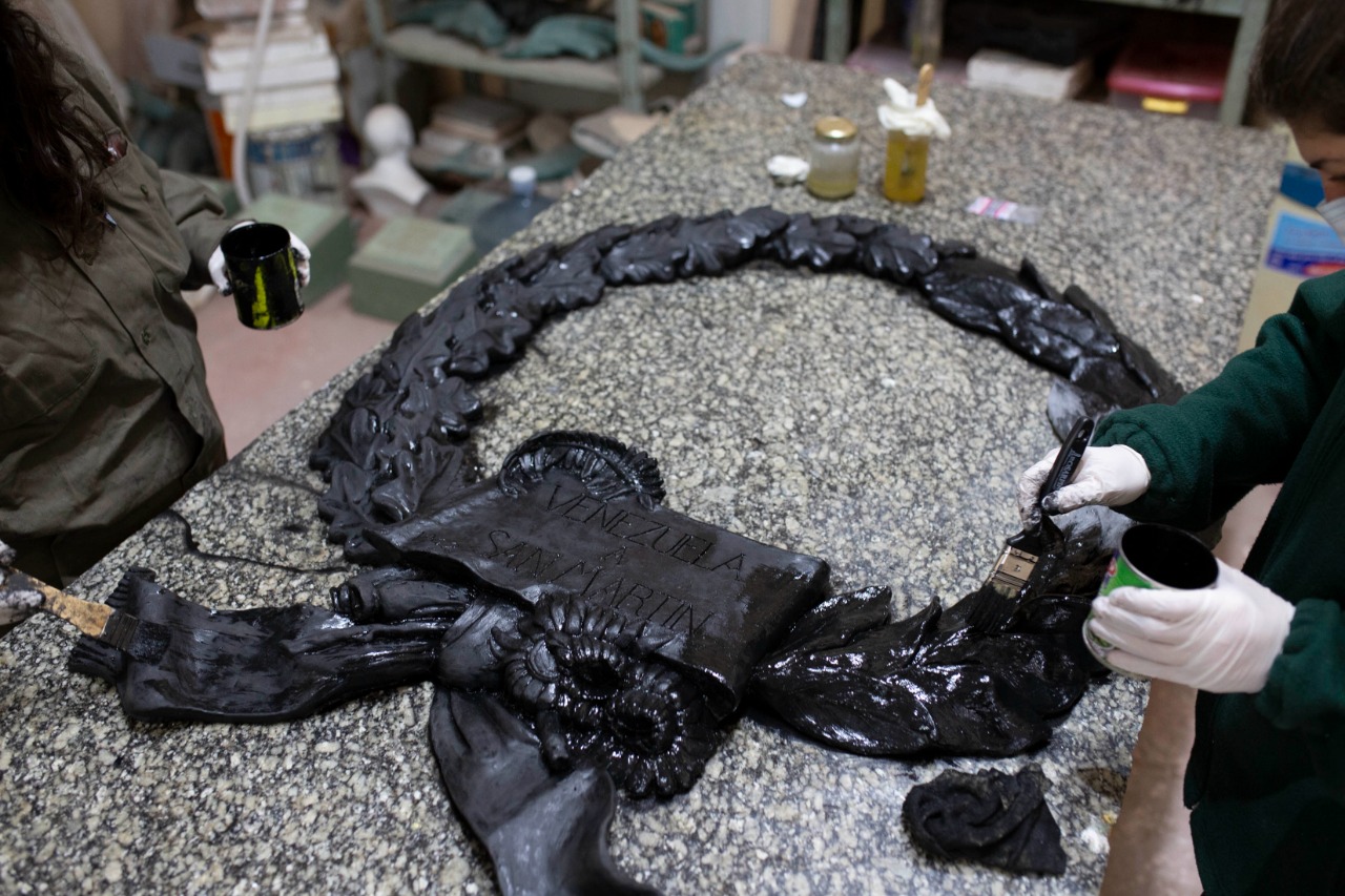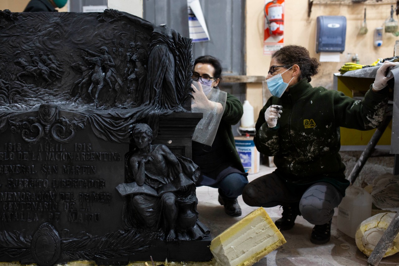 De los 16 yelmos decorativos, que originalmente eran de bronce, se recuperaron cuatro y con esos originales se hicieron los moldes y se realizaron las nuevas piezas en cemento platinado. La última intervención fue en uno de los relieves más importantes del Monumento, con una corona de robles, también de bronce en su original, que fue reemplazada por una pieza igual, pero de cemento imitación bronce, como los yelmos. Los artistas usaron como guía imágenes de archivo para hacer modelos en plastilina y luego poner manos a la obra en la creación de cada pieza.