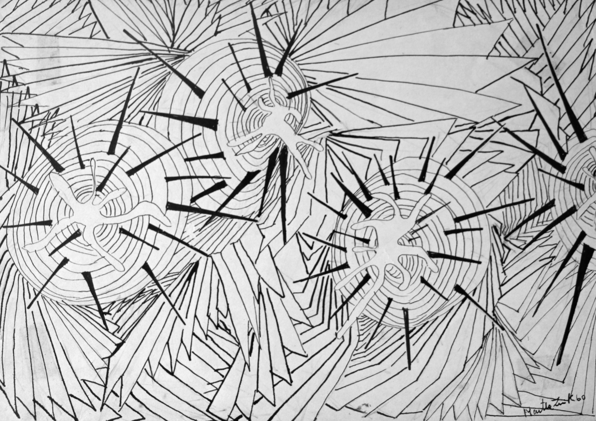 En este conjunto de obras se puede ver cómo la línea del dibujo se atiborra, se acurruca, ocupa y despliega sobre la superficie ocupando el soporte, en su mayor parte, hasta los límites.