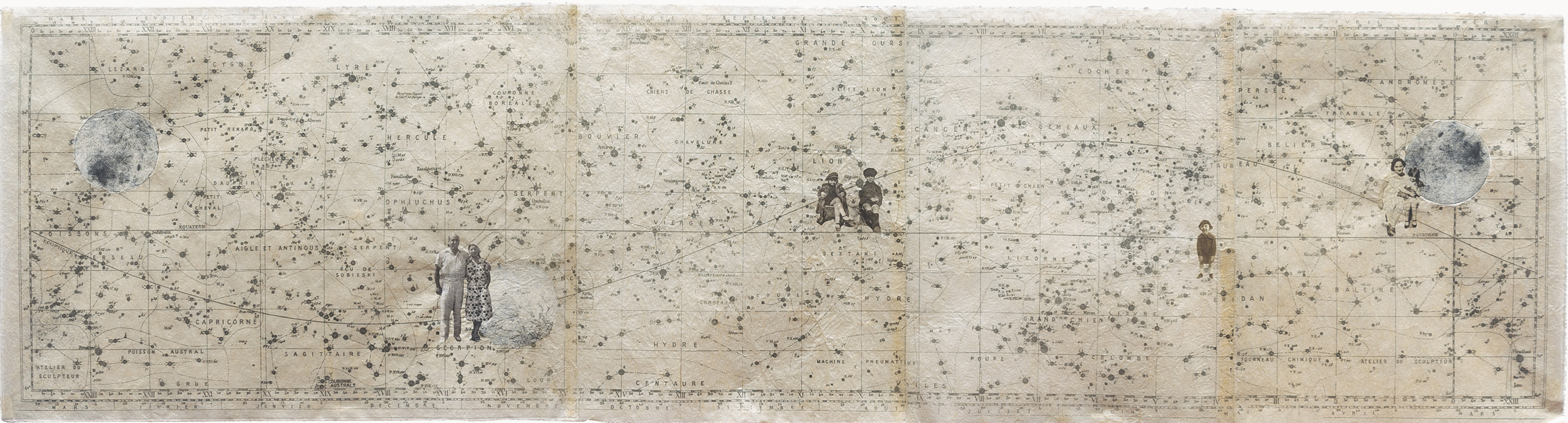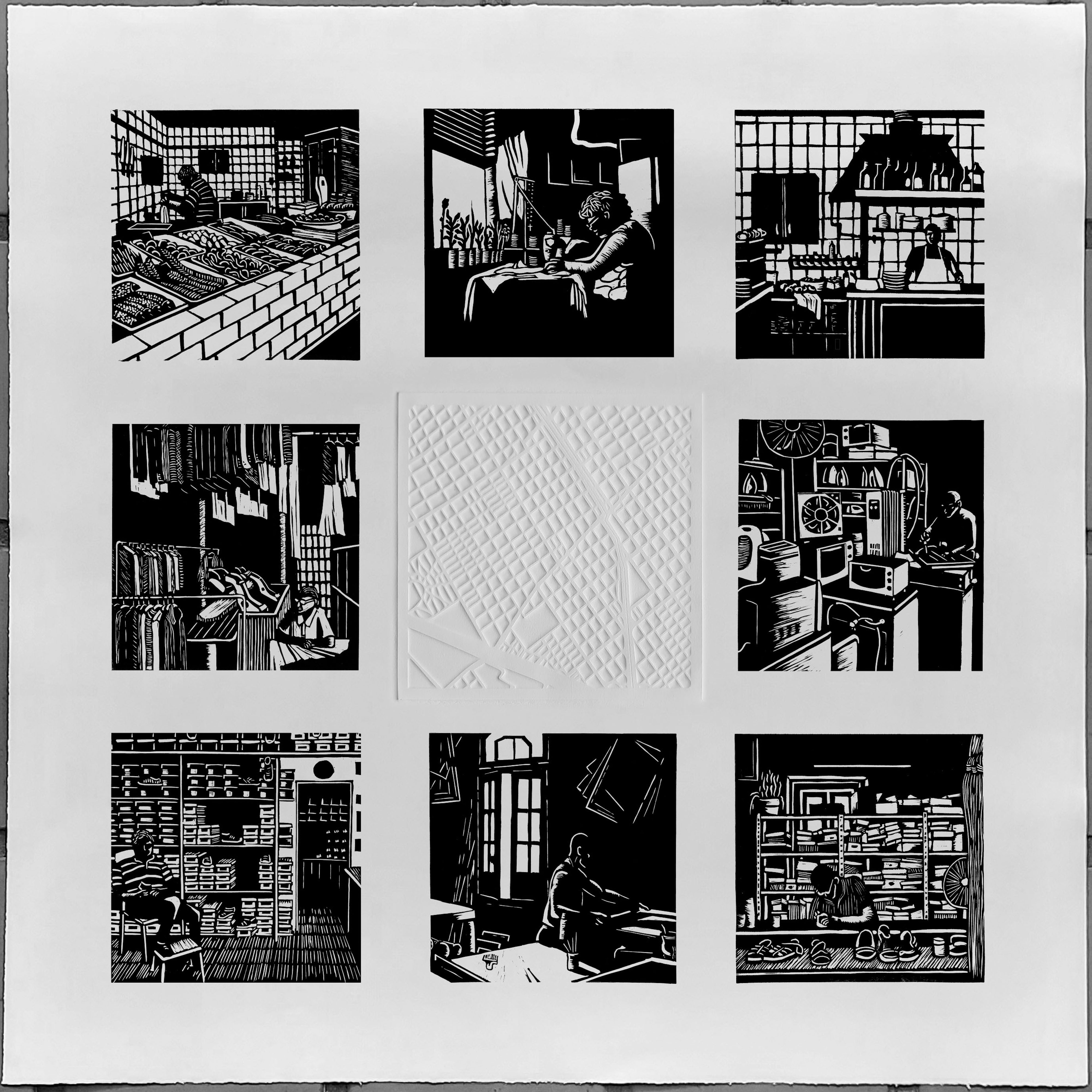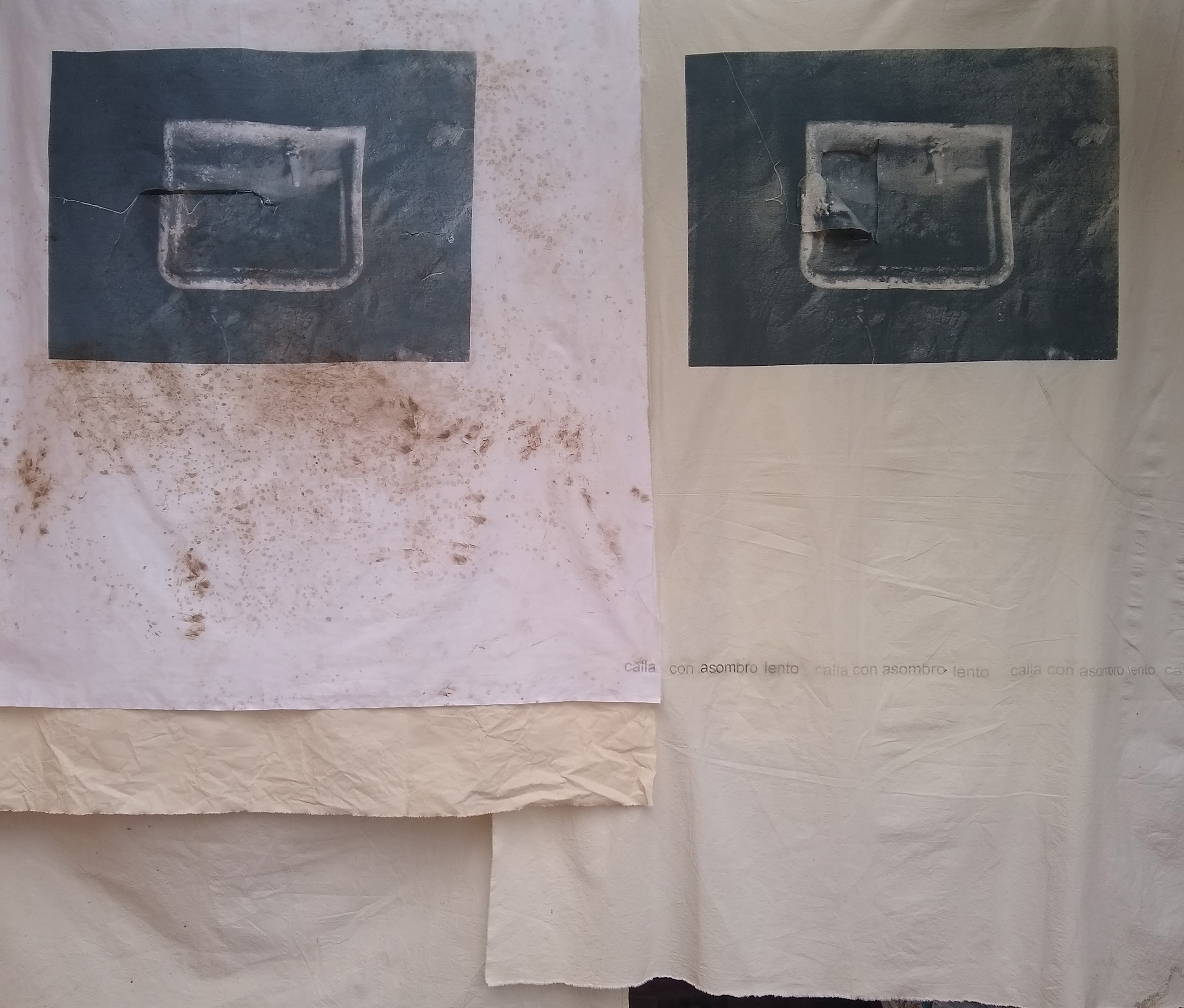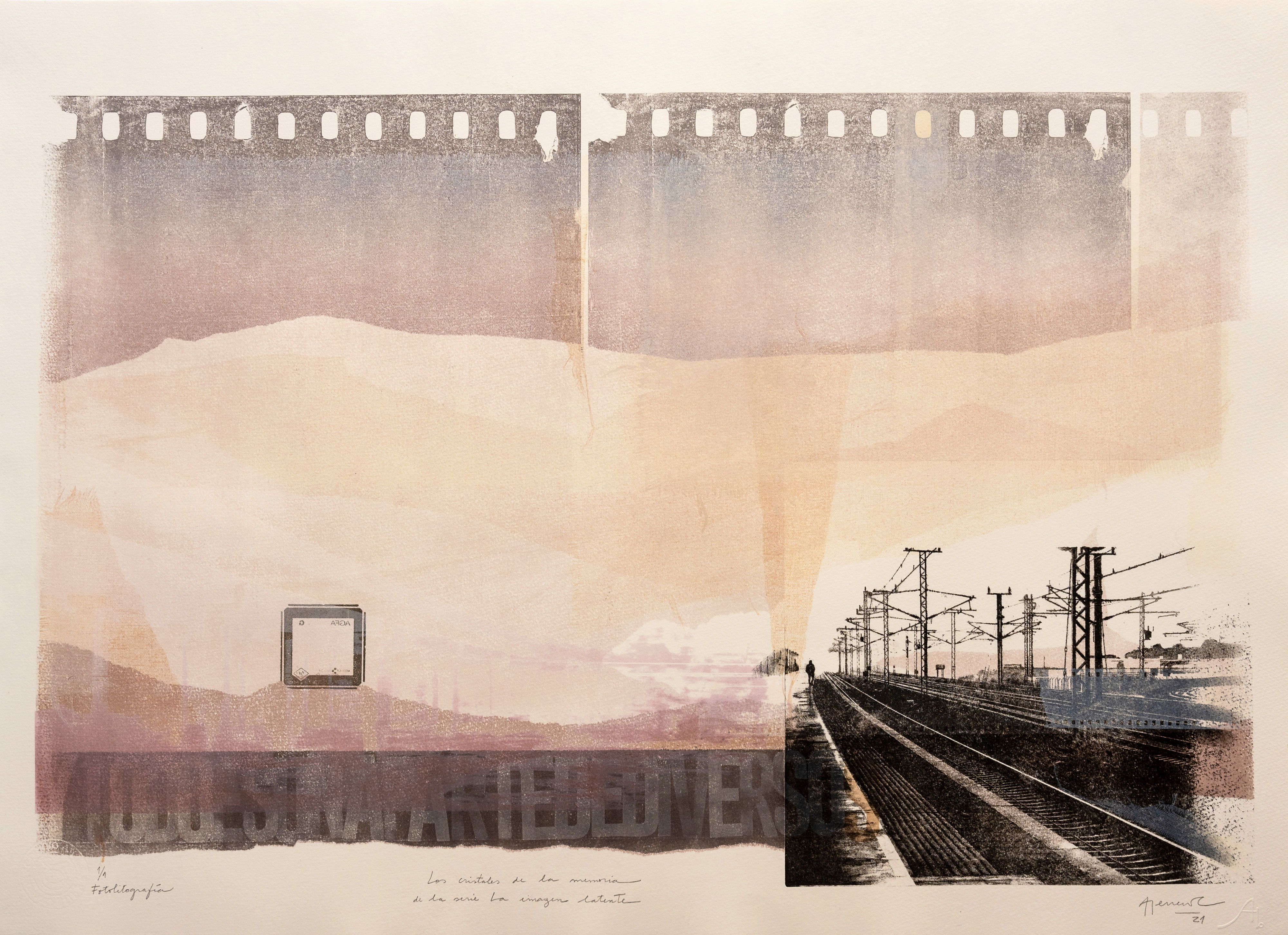 Fotolitografía sobre ambos papeles, el superior es papel Japón recortado y montado para jugar con la transparencia