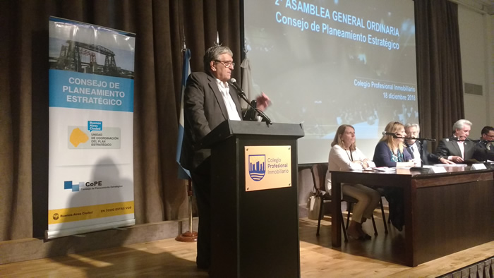 En el Salón Auditorio del Colegio Profesional Inmobiliario se desarrolló la Segunda Asamblea General Ordinaria del Consejo de Planeamiento Estratégico. En nombre de la entidad anfitriona, miembro del CoPE, que gentilmente facilitó sus instalaciones para celebrar la Asamblea, su Presidente, el Sr. Armando Pepe, fue el encargado de pronunciar las palabras de bienvenida a las autoridades y organizaciones presentes. Refiriéndose a la labor que realizan las organizaciones de la sociedad civil expresó: “Sabemos perfectamente que este camino es un proceso participativo en el que todas las instituciones intercambian ideas y aportan sus capacidades individuales, con el fin de obtener potenciales colectivos”.