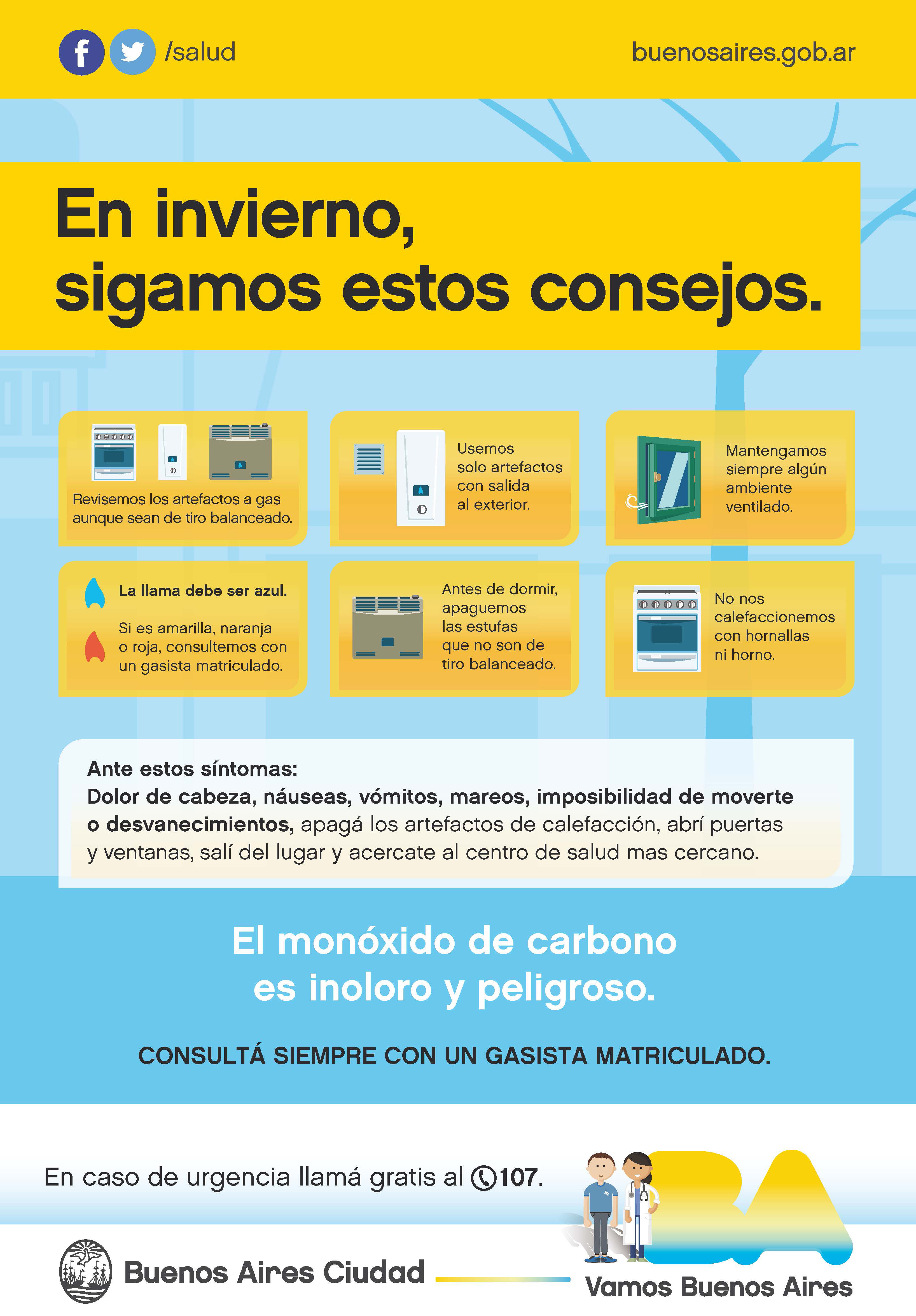 Debido a la llegada de las bajas temperaturas, el Gobierno de la Ciudad de Buenos Aires, a través del Ministerio de Salud, realizó una serie de recomendaciones para los vecinos a fin de prevenir intoxicaciones por la inhalación de monóxido de carbono, que se origina en la combustión producida por artefactos de calefacción utilizados en ambientes cerrados y que provoca anualmente alrededor de 200 muertes en el país.