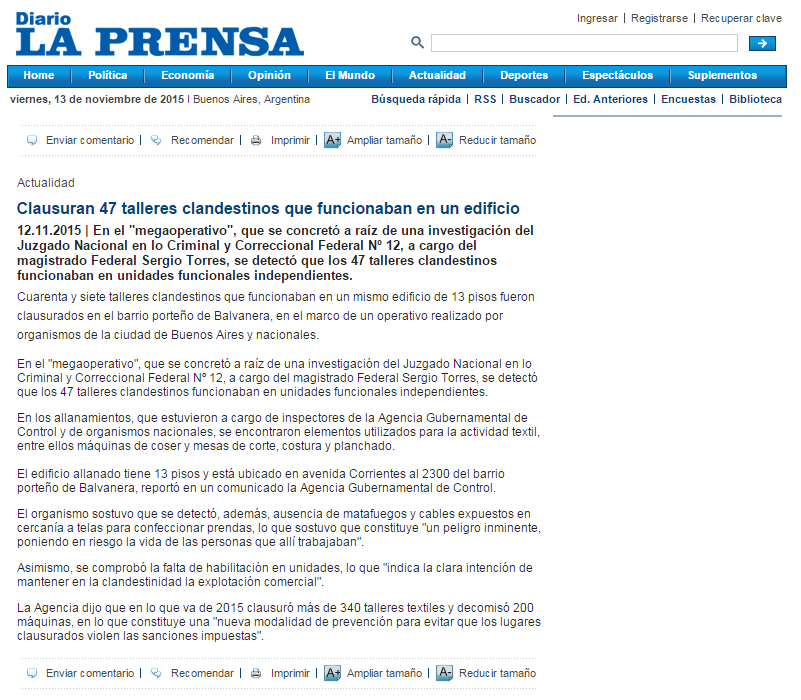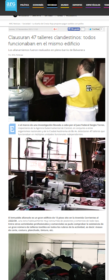 En el marco de una investigación del Juzgado Nacional en lo Criminal y Correccional Federal Nro 12 a cargo del Juez Federal Sergio Torres, inspectores de la Agencia Gubernamental de Control, en conjunto a otros organismos nacionales y de la Ciudad Autónoma de Bs As. detectaron 47 talleres que funcionaban en múltiples unidades funcionales independientes.