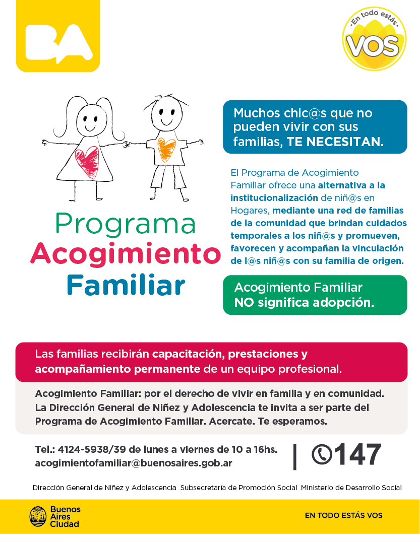 En la Ciudad de Buenos se sancionó en 2006 la ley 2.213, que creó el Sistema de Acogimiento Familiar Transitorio, entendido como el cuidado por un tiempo y no en una institución, brindado por una familia de la comunidad al niño, niña o adolescente cuando exista una medida de protección de derechos que determine necesaria la separación la familia.