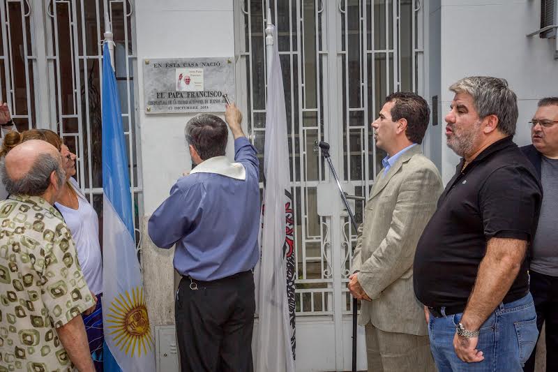 El vicepresidente 1º de la Legislatura porteña, Cristian Ritondo, y los legisladores Roberto Quattromano (PRO) y Cristina García de Aurteneche (Confianza Pública) descubrieron este mediodía una placa en la casa donde nació el Papa Francisco en el día de su cumpleaños. La propiedad que ahora lleva la placa "En esta casa nació el Papa Francisco" se encuentra en la calle Varela 268, en el barrio de Flores.