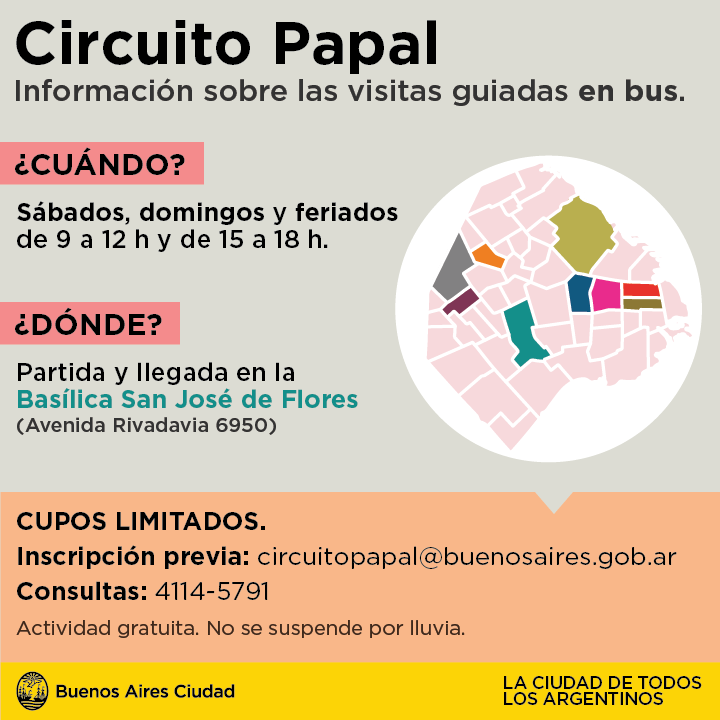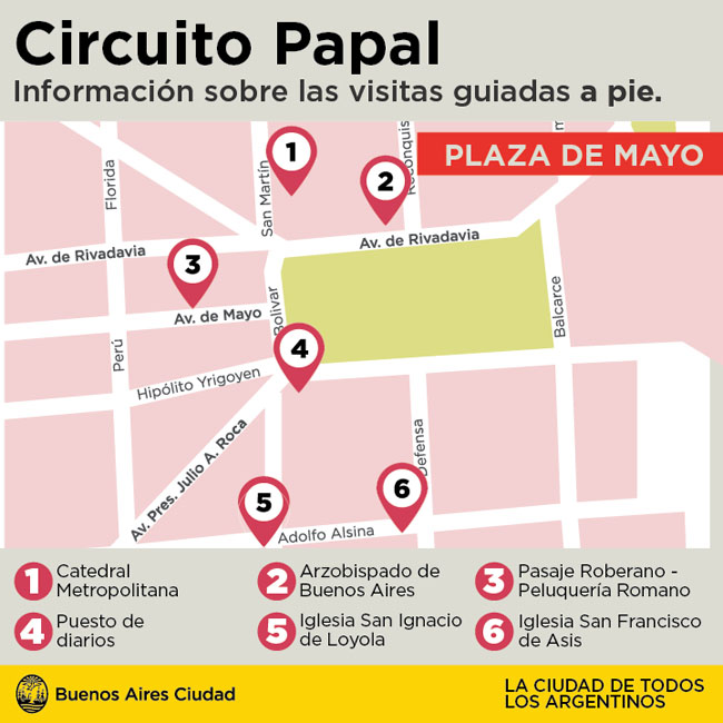 La Ciudad comenzará a implementar de manera gratuita el Circuito Papal en bus a partir del fin de semana del 11 y 12 de mayo, y continuará realizando las visitas guiadas a pie que arrancaron el martes 7 y el jueves 9 de mayo, en honor a la reciente designación del Papa Francisco.