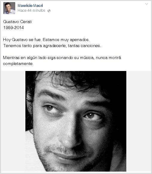 "Hoy Gustavo se fue. Estamos muy apenados. Tenemos tanto para agradecerle, tantas canciones. Mientras en algún lado siga sonando su música, nunca morirá completamente", escribió el jefe de Gobierno porteño Mauricio Macri en su cuenta de Facebook.