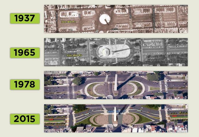 Un monumento privilegiado que vio crecer a la histórica avenida es el Obelisco, ya que fue levantado en la Plaza de la República en 1936 por obra del arquitecto Alberto Prebisch. Con sus 67,50 metros y sus 1800 toneladas es la postal clásica de Buenos Aires y uno de sus lugares desde donde se puede apreciar la magnitud de la tradicional avenida.
