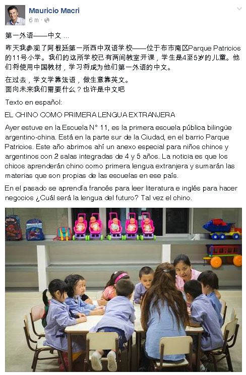 El jefe de Gobierno porteño, Mauricio Macri, inauguró recientemente la primera escuela pública bilingüe argentino-china en el marco de un acuerdo con la ciudad de Beijing, que cuenta con el apoyo del gobierno chino, y sostuvo que con este hecho “estamos dando un paso inédito e histórico para la educación pública”.