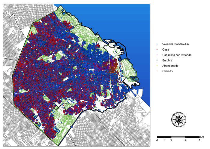 Realizado entre marzo de 2010 y diciembre de 2011 en colaboración con la Agencia Gubernamental de Control, del trabajo se desprende que los edificios, un total de 273.008 unidades, suman casi la mitad de los registros con un 48,3%. Le siguen en importancia 115.549 locales comerciales a la calle, significando un 20,9%. Aquellos emplazados en galerías comerciales y shoppings centers suman 11.356 locales, y representan el 2,0% del total de usos. Por su parte, los garajes privados suman el 20,2% y se relevaron en 111.741 parcelas. Los edificios de destino único suman 15.272 registros (2,7%), y si bien tienen un peso menor en lo referido a la suma absoluta de las actividades halladas, poseen una gran importancia en lo que hace a la dinámica propia de la Ciudad.