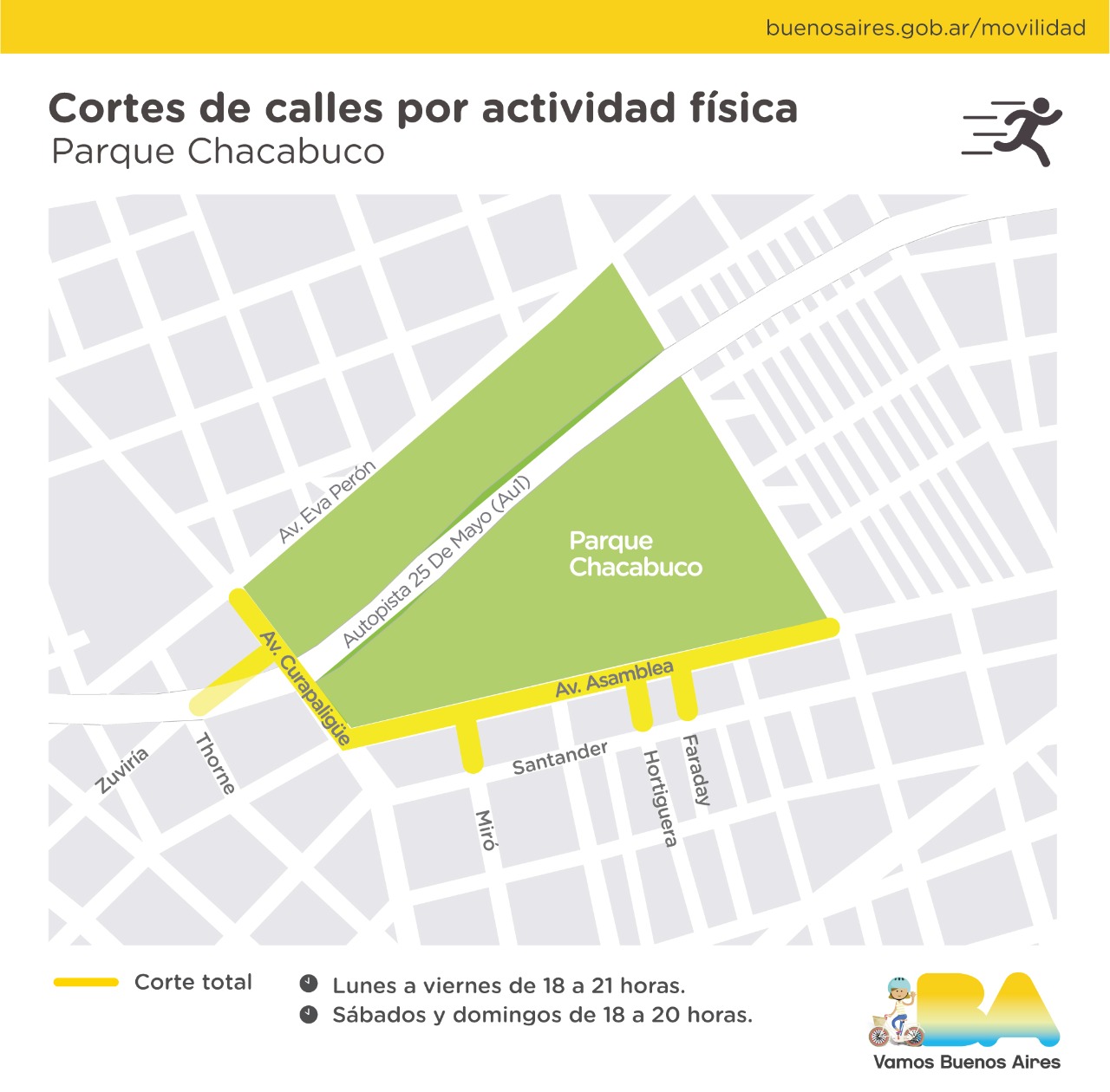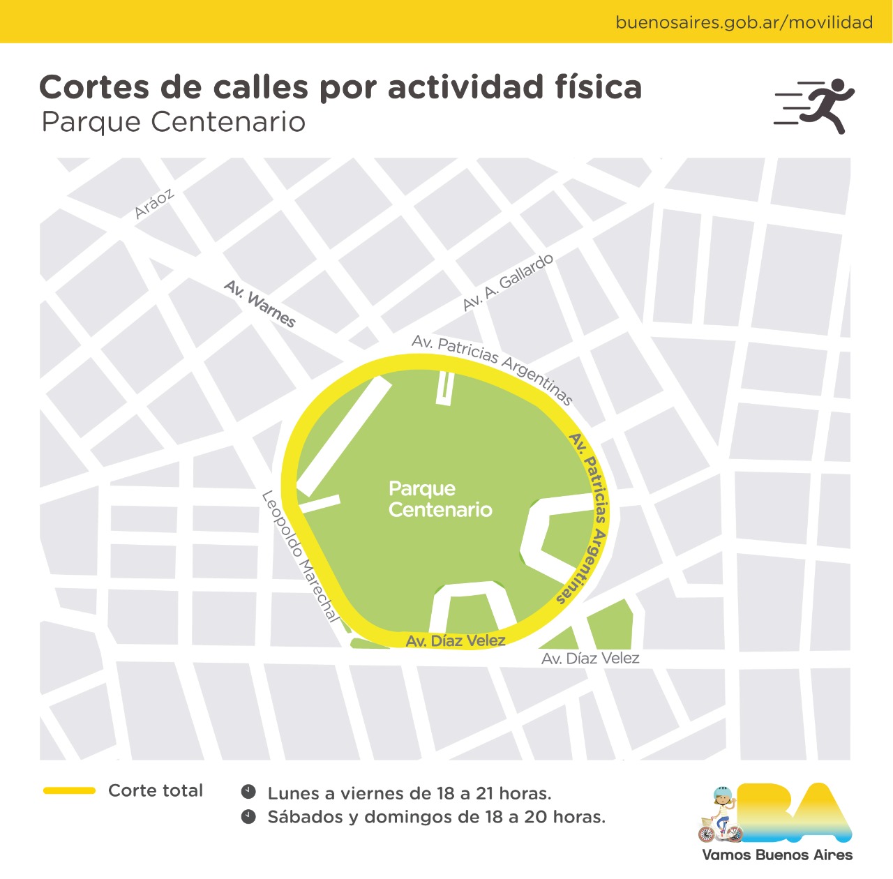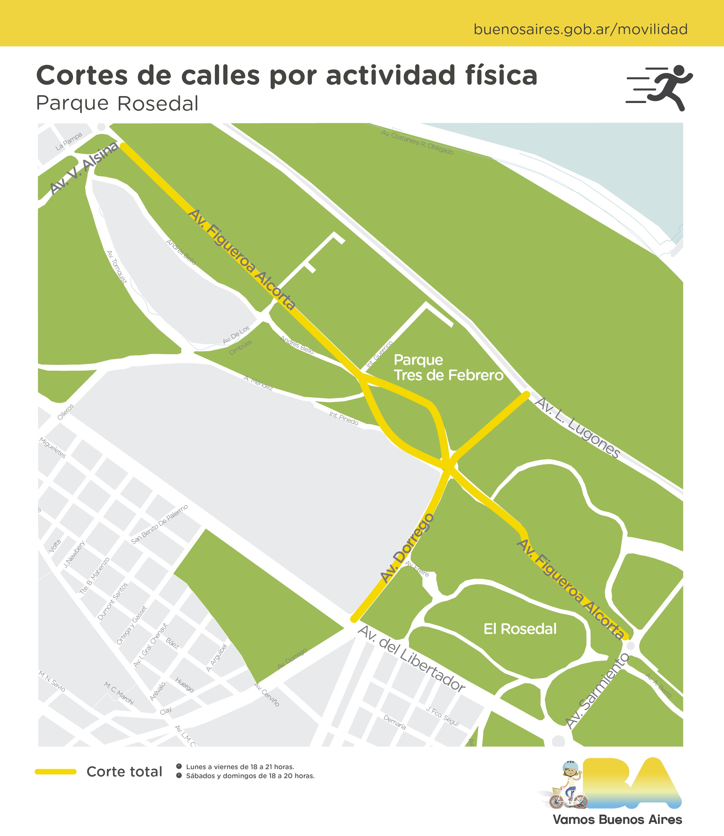 Se trata de cortes totales que suman 14 km lineales y ampliarán el espacio peatonal en las inmediaciones de Plaza Arenales y los parques Tres de Febrero (Bosques de Palermo), Centenario, Saavedra y Chacabuco, para garantizar distanciamiento físico y reducir los riesgos de contagio.