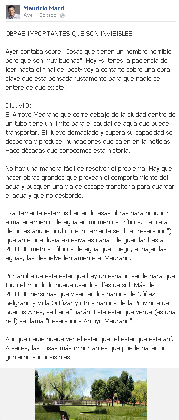 La Ciudad de Buenos Aires tiene más reservorios de agua. Por ejemplo, los dos lagos de los bosques de Palermo que funcionan como cuencos reguladores. También sobre la cuenca del Arroyo Cildañez, en el Sur, hay tres lagos que cumplen la misma función.