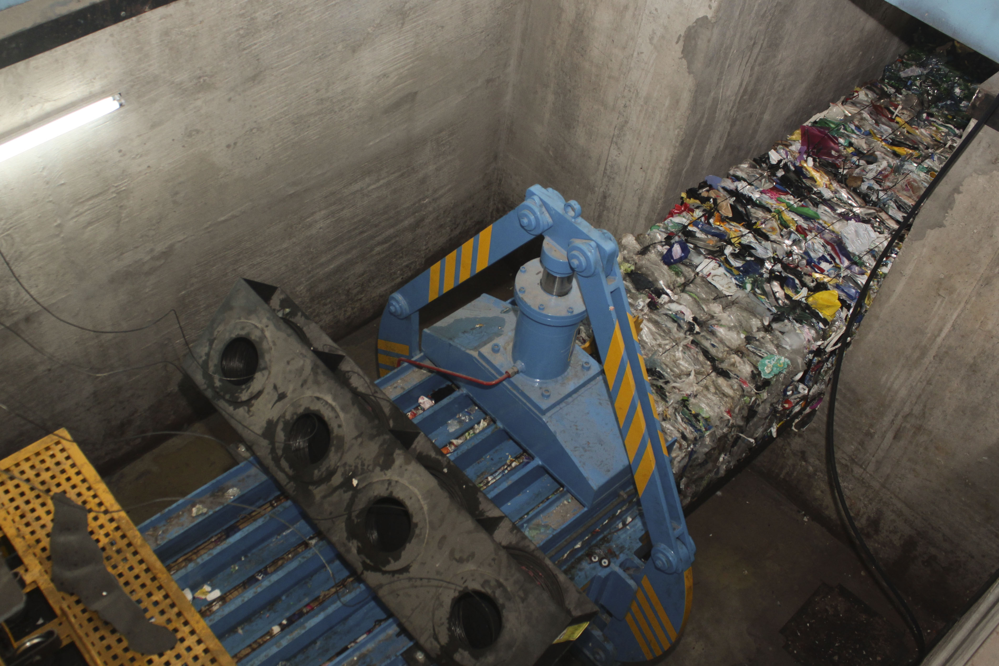 - Una enfardadora: Sirve para compactar los residuos para su posterior venta. Es una máquina con un pistón que compacta el cartón, el papel, el plástico y el metal, cada uno ya separado, para hacer “fardos” o bloques de entre 400 y 450 kg cada uno.