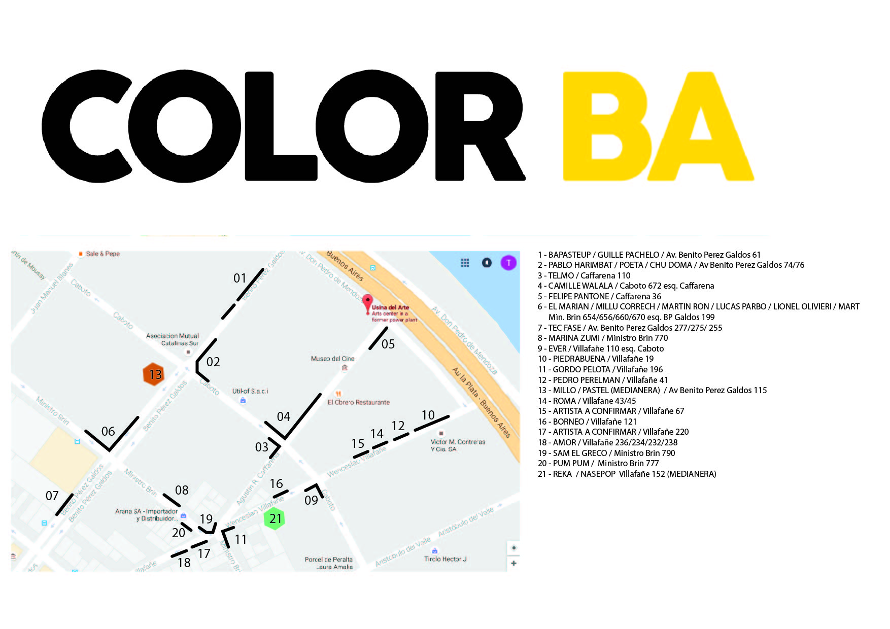 Entre los artistas renombrados de todo el mundo que participaron en Color BA están Reka (Australia), Millo (Italia), Telmo Pieper (Holanda), Camille Walala (Francia), Nase Pop (Holanda). Y los argentinos Felipe Pantone, Parbo, Martín Ron, Pastel, Gordo Pelota, Zumi y P3Dro Perelman, entre otros.