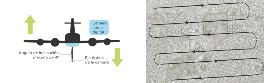 Entre dos pasadas consecutivas, generalmente voladas en sentido inverso, existirá un solape o recubrimiento transversal, previamente fijado (der.). El avión que transporta la cámara o sensor sobrevuela la zona a relevar a una altura y velocidad constantes (izq.).