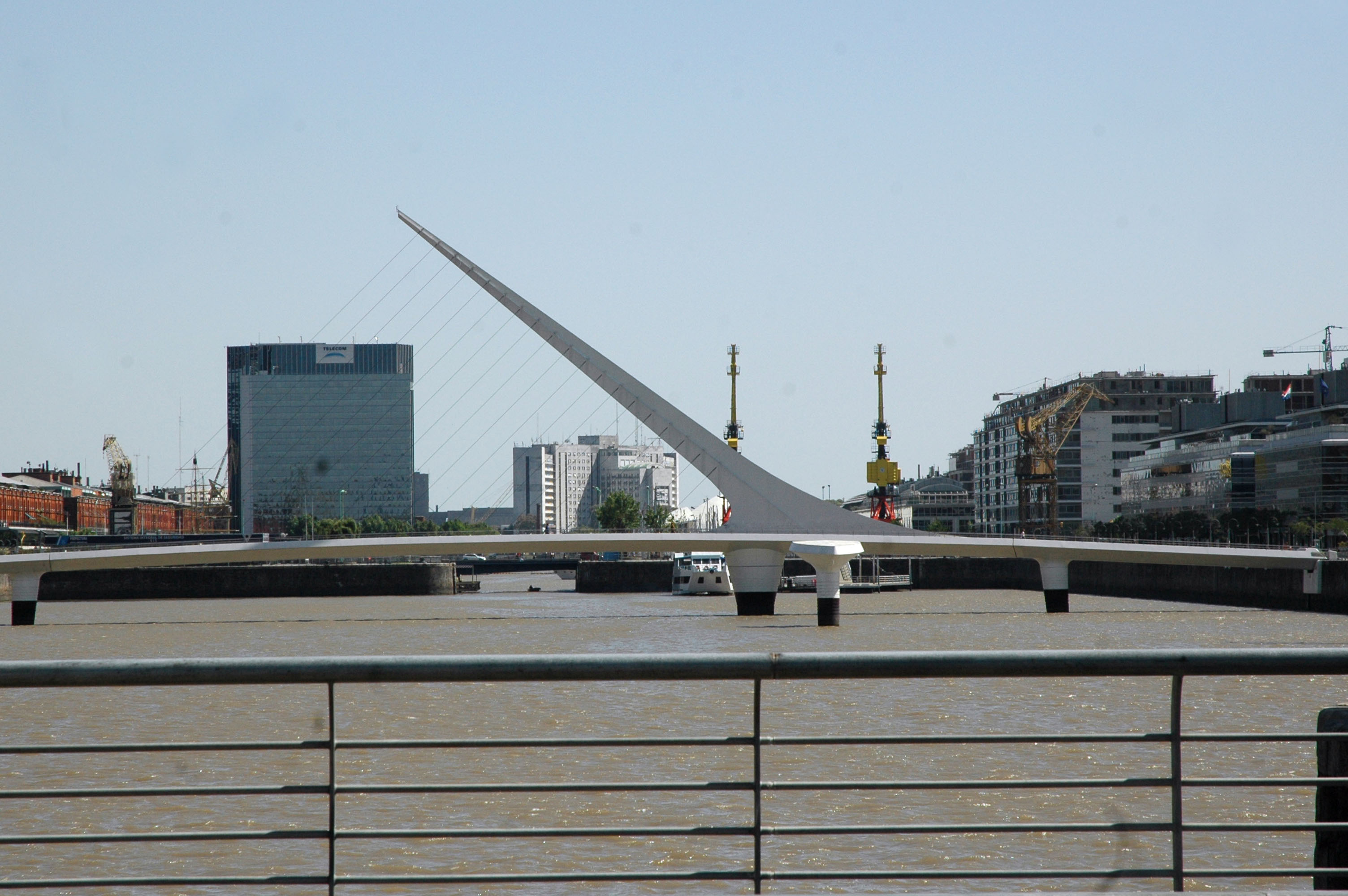 Fue inaugurado oficialmente en diciembre de 2001. Consta de un cuerpo cubierto en madera, de 160 metros de largo, y un obelisco inclinado de 39 metros de altura, sostenido por varios tensores, lo que le da la forma de una gran arpa. Posee un tramo central móvil giratorio que permite el paso de las embarcaciones.