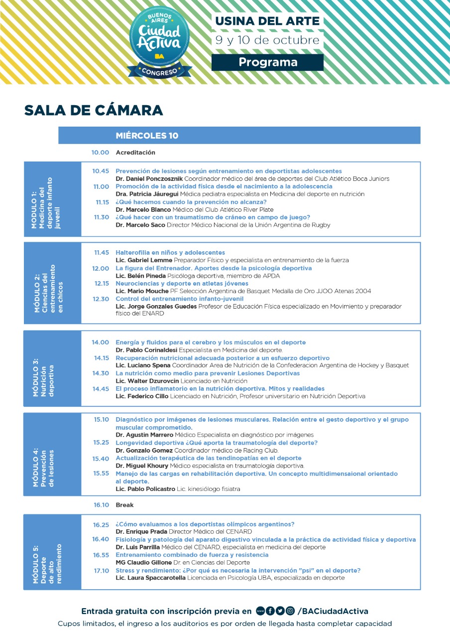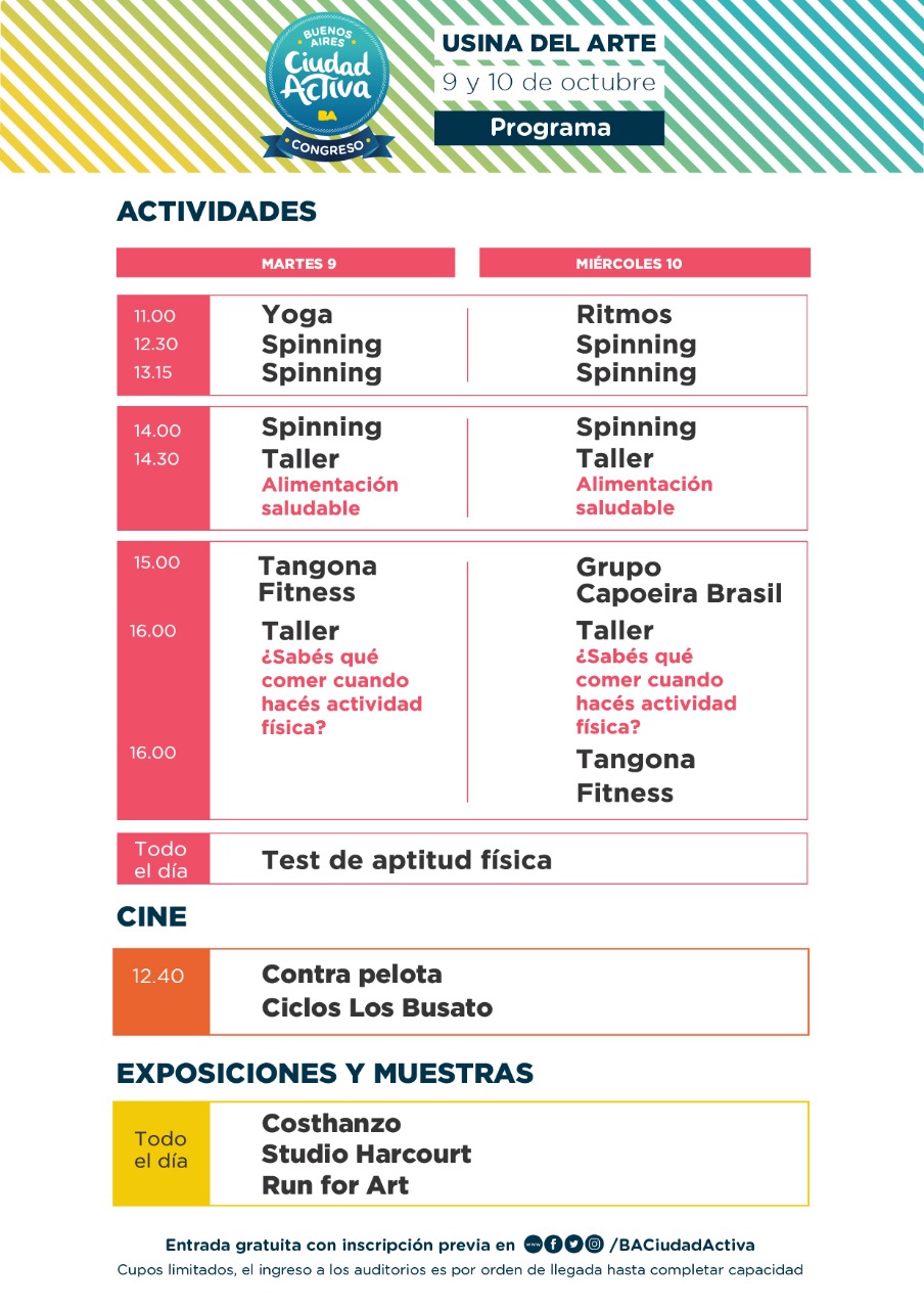 El Congreso Buenos Aires Ciudad Activa es una invitación al vecino y ciudadano activo, el martes 9 y miércoles 10 de octubre en la Usina el Arte, para conocer todo sobre: tendencias e innovación en salud y medicina deportiva; cultura del movimiento, actividad física y deporte; tecnologías aplicadas y bienestar. Un evento brindado por prestigiosos especialistas y referentes, nacionales e internacionales, de diferentes disciplinas médicas y deportivas.
